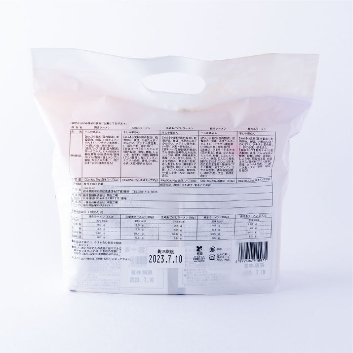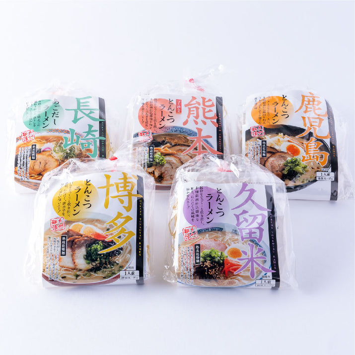 | 内容量 | 博多ラーメン:100g(めん70g、液体スープ30g) 久留米ラーメン:100g(めん70g、液体スープ30g) 長崎あごだしラーメン:99g(めん70g、液体スープ29g) 熊本ラーメン:100g(めん70g、液体スープ30g) 鹿児島ラーメン:100g(めん70g、液体スープ30g) |