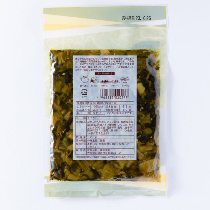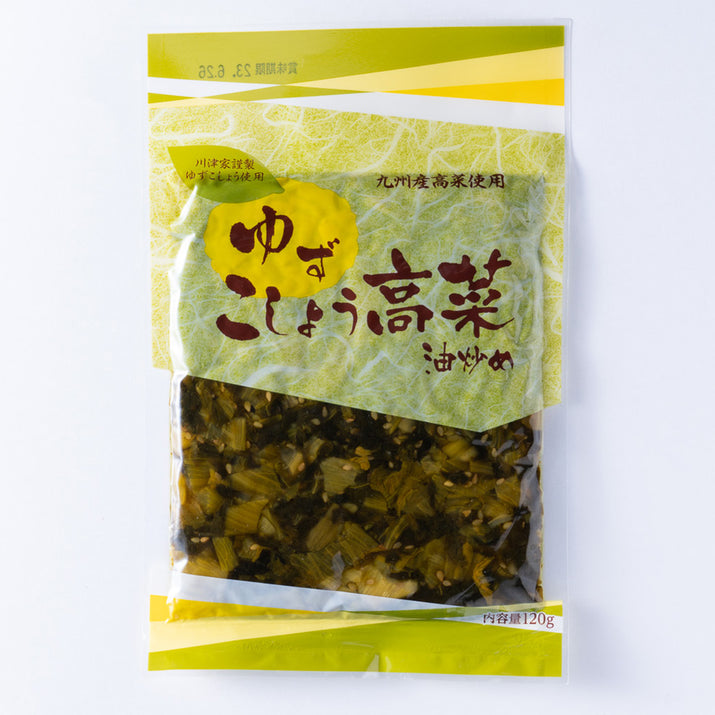 原材料名 たかな(九州産)、アミノ酸液、食用なたね油、食塩、果糖ブドウ糖液糖、いりごま、ゆずこしょう(ゆず皮、青唐辛子、食塩)、唐辛子/調味料(アミノ酸等)、酸味料、ウコン色素、(一部にごまを含む)