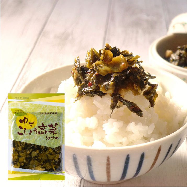 九州特産のお漬物「高菜漬」と大分県特産の「柚子胡椒」。油でじっくりと炒めたら、こんなにも美味しいご飯のお供が完成しました!