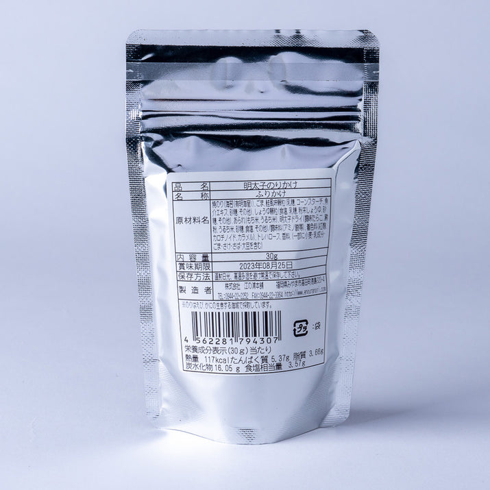 原材料名 | 焼のり(海苔(有明海産))、ごま、鮭風味顆粒(乳糖、コーンスターチ、魚介エキス 、砂糖、その他)、しょうゆ顆粒(食塩、乳糖、粉末しょうゆ、砂糖、 その他)、あられ(もち米、うるち米)、明太子ドライ(調味たらこ、澱粉、うるち米、砂糖、食塩 、その他)/調味料(アミノ酸等)、着色料(紅麹、カロチノイド、カラメル)、トレハロース、香料、(一部に小麦・乳成分・ごま・さけ・さば・大豆を含む) |