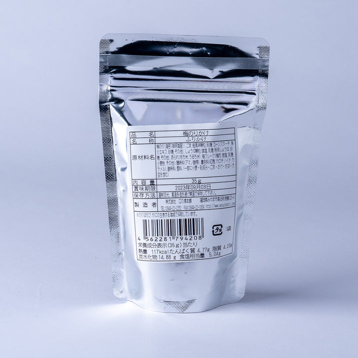 原材料名 | 乾海苔(海苔(国内製造)、ごま、鮭顆粒(乳糖、コーンスターチ、 魚介エキス 、砂糖、その他)、しょうゆ顆粒(食塩、乳糖、粉末しょうゆ 、砂糖、 その他)、あられ(もち米、うるち米)、梅フレーク(梅肉、食塩、乳糖、小麦、その他)/香料、調味料(アミノ酸等)、着色料(紅麹、カラメル色素、カロチノイド)、酸化防止剤(ビタミンE)(一部に乳・小麦・大豆・鯖・鮭・ごまを含む) |