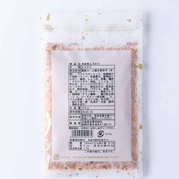 原材料名 | 荒粉ロール挽き唐辛子(中国)、フライドガーリック、乾燥味付け挽肉(ラード、乾燥卵白、植物性たんぱく、豚肉、しょうゆ、砂糖、鶏肉、チキンエキス、食塩、こしょう、たまねぎ、ガーリックパウダー、ジンジャーパウダー)、粉末白みそ、粉末赤みそ、ラードパウダー、食塩、砂糖、ガーリックパウダー、酵母エキス/調味料(アミノ酸等)、酸化防止剤(V.E、ローズマリー抽出物)、カラメル色素、(一部に小麦・卵・大豆・豚肉・鶏肉を含む) |